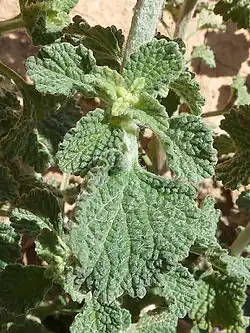 Es una planta herbácea perenne sufruticosa, de base algo leñosa y tallo con sección redondeada o cuadrangular de 15-80cm de altura, frecuentemente ramificado, con indumento más o menos denso, grisáceo. Las hojas, de 2-7 por 1-4cm, son pecioladas, irregularmente dentadas, profundamente surcado-reticuladas de aspecto crespo, peludas, rugosas por el haz y con nervios marcados por el envés. Las inflorescencias se organizan en verticilos globulares densos de flores de cáliz medio centimétrico de garganta muy pelosa, con 6-12 dientes y de corola bilabiada de color blanquecino o crema, con tubo de 3,5-5 mm, labio superior bífido de 2-3,5 mm con 2 lóbulos alargados, y el labio inferior trilobulado de 2-3,5 mm con el lóbulo central ancho y los 2 laterales muy pequeños. Los estambres están incluidos en el tubo de la corola, los inferiores más largos, con filamentos muy cortos y estigma bífido. Los frutos son esquizocarpos tetranuculares de mericarpos ovoideo-elipsoides y trigonas de 1,5-2 por 1mm, punteados, de color castaño obscuro-negruzco.[1][2]