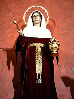 | Atributos | Usualmente se muestra con una cruz, con una antorcha, con un dragón a sus pies, vestida de azul o verde, con el delantal y las llaves a la cintura, sirviendo a los huéspedes. | ||