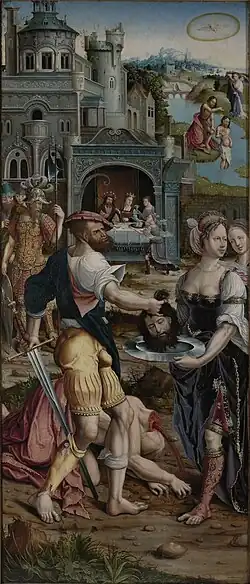 Según los Evangelios sinópticos, Herodes, que era tetrarca, o subrey, de Galilea bajo el Imperio romano, había encarcelado a Juan el Bautista porque reprendió a Herodes por divorciarse de su esposa (Fasaelis, hija del rey Aretas de Nabatea) y tomar ilegalmente a Herodías, la esposa de su hermano Herodes Filipo I. En el cumpleaños de Herodes, la hija de Herodías, a quien Josefo identifica como Salomé, bailó ante el rey y sus invitados. Su baile agradó tanto a Herodes que en su borrachera prometió darle todo lo que deseara, hasta la mitad de su reino. Cuando Salomé preguntó a su madre qué debía pedir, ésta le dijo que pidiera la cabeza de Juan el Bautista en una bandeja. Aunque Herodes se horrorizó por la petición, accedió a regañadientes e hizo ejecutar a Juan por decapitación en la prisión.[17] En el arte, el episodio se conoce como El festín de Herodes.