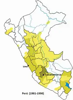 Ubicación de Lucanamarca en el Perú, con las áreas de influencia de Sendero Luminoso en amarillo. | ||