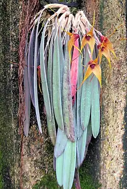 Es una orquídea de gran tamaño, que prefiere clima fresco y agradable. Es de hábitos epifitas con fuertes tallos colgantes basalmente envueltos por 2 a 3 vainas tubulares llevan una única hoja erguida, apical, coriácea, con tintes de color púrpura azulado, angostamente obovada, obtusa que se gradualmente va disminuyendo en la base. Florecen una inflorescencia colgante 2,5 a 5 cm de largo, con flores simples y con una bráctea basal y un tubo de bráctea floral. La flor es grande, de hasta 23 cm de largo, y maloliente, surgiendo en medio de las hojas.[1]