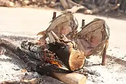 Luego, el pescado se empala en dos afiladas pilas de madera o se coloca en una gran parrilla de hierro fundido con asa y una caja de cierre, diseñada específicamente para este plato.
