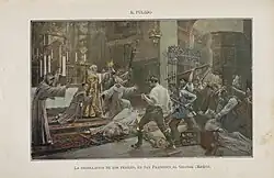 Arrecia el tumulto. Las turbas se distribuyen en grupos, se reparten por los conventos. A mediodía un tropel de mujeres arrastra a un lego. A las tres de la tarde penetran las turbas en el convento de jesuitas de San Isidro; matan, saquean, incendian...Benjamín Jarnés, Sor Patrocinio. La monja de las llagas, IV.