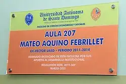 El 11 de marzo del 2022, pasados 6 años de su muerte, autoridades de la Universidad Autónoma de Santo Domingo durante el rectorado de la Dra. Emma Polanco y el decano de la Facultad de Ciencias Económicas y Sociales el Mtro. Alexis Martínez, en presencia de familiares y amigos, inauguran el aula 207 designada a nombre del Mtro. Mateo Aquino Febrillet, aprobado por el Consejo Universitario de la universidad mediante la resolución No.2019-369.