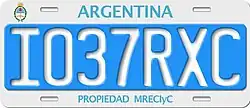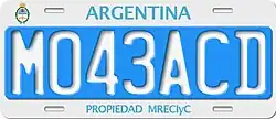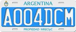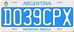 | Cuerpo diplomático | D123xxA | Su diseño es similar a las de los autos particulares, con la diferencia de que se reemplaza el color negro del fondo por un azul claro. Además, en la parte inferior se agrega la denominación "PROPIEDAD MRECIyC" en color celeste. En cuanto a la numeración, consta de una primera letra que representa el tipo de organismo, seguida de tres números asignados por orden. Luego, las dos letras asignadas a cada país u organismo y finalmente una letra aleatoria. Esta última letra indica si es un vehículo de uso oficial (B-H) o personal (I-Z).[8] La letra A queda reservada para el Jefe de Misión. En la imagen se observan las letras CP, que representan a la República Portuguesa. |