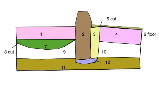 Empezando por el fondo, el orden en que ocurrieron los acontecimientos en esta sección es revelado por la matriz como sigue. A la formación de la tierra natural 11 siguió la deposición de las capas 9 y 10, que «probablemente» tuvo lugar como el mismo acontecimiento. Después se cavó un foso superficial 8, el cual se llenó con 7. Esto fue «sellado» por la deposición de la capa 1, probablemente el mismo suceso que la capa 4. A continuación tuvo lugar un cambio en el uso del terreno y se cavó la zanja 5, inmediatamente seguida por el pisoteo de los constructores 12 que trabajaban en la zanja de construcción 5; quienes después construyeron el muro 2, tras el cual rellenaron el espacio entre el muro 2 y la zanja 5 con el relleno 3. Por último, el suelo de arcilla 6 se depositó a la derecha del muro 2, sobre el relleno 3, lo cual indica una probable superficie interior.