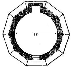 - el superior es más pequeño, accesible mediante una escalera y antiguamente rodeado por un deambulatorio con columnillas que lo embellecía y del que sólo quedan trazas en el nacimiento de los arcos en las paredes. Su forma es también decagonal al exterior y circular al interior.