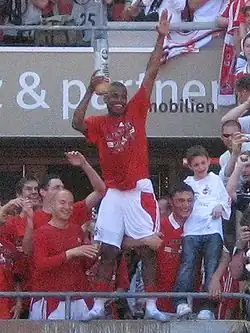 Al final del último partido en contra del Mainz por 2-1; Maynor, los jugadores del Colonia y toda su hinchada, celebraron a lo grande el ascenso en el estadio Rhein Energie Stadium.