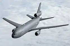 El McDonnell Douglas KC-10 Extender es un avión cisterna de reabastecimiento en vuelo estadounidense, operado por la Fuerza Aérea de los Estados Unidos (USAF). Versión militar del avión comercial trimotor DC-10, el KC-10 fue desarrollado a partir del Programa de Avión de Carga y Cisterna Avanzado (Advanced Tanker Cargo Aircraft Program).[N 1] Incorpora equipo específico militar para sus tareas principales de transporte y reabastecimiento aéreo. Fue desarrollado para complementar al KC-135 Stratotanker tras las experiencias adquiridas en el Sudeste Asiático y en Oriente Medio. El KC-10 fue el segundo avión de transporte de McDonnell Douglas en ser seleccionado por la Fuerza Aérea, después del C-9. Se produjo un total de 60 KC-10 para la USAF. La Real Fuerza Aérea de los Países Bajos opera dos cisternas similares designados KDC-10, que fueron convertidos desde aviones DC-10.