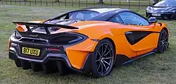 Está basado en el 600LT, ya que solamente la estética es compartida, pero adopta elementos propios del GT4, como un spoiler trasero hecho de carbono que ofrece un sustento aerodinámico extra de hasta 185 kg (408 lb) a 250 km/h (155 mph). El mismo material que se ha utilizado para el chasis Monocell que rebaja el peso considerablemente, incluso en el interior con los asientos de cubo.