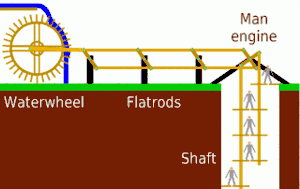 Estos mecanismos articulados se empleaban para transferir el movimiento entre la rueda hidráulica y los equipos de bombeo cuando se encontraban alejados entre sí.[4] Aunque la mayor parte de las piezas de los mecanismos eran de madera, se colocaban collares de hierro de refuerzo en los ejes de las ruedas, en los tubos de conexión y en los manguitos, así como en ciertas partes de las bielas de madera (listones largos y escuadrados que transmitían la potencia de forma horizontal o inclinada). También tenían juntas de hierro articuladas que estaban diseñadas de tal manera que podían intercalarse entre sí y asegurarse con pernos o tornillos.[6]