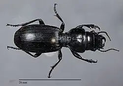 Su longitud es 29–36 mm, ancho pronotal de 7,9–10,2 mm y elitral de 9,1–11,6 mm. El color de todo el cuerpo varía de mate a negro brillante (especialmente el pronoto).[2]
