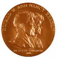 ![]() Medalla de oro del congreso concedida al presidente de los EE. UU. Ronald Reagan y a la primera dama, Nancy Reagan, 2002. | ||