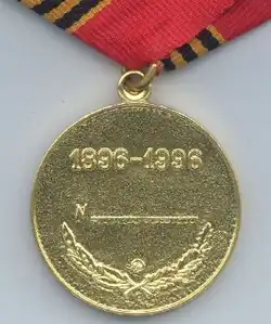 El reverso original de la medalla, según lo dispuesto por el Decreto del Presidente de la Federación de Rusia de 6 de marzo de 1995 N.º 243, tenía en el centro, grabados en relieve en letras grandes los años «1896-1996» y ramas de roble y laurel en la parte inferior después de la circunferencia inferior de la medalla.[2] Algunos fabricantes fabricaron una variante de la medalla con una inscripción más pequeña (1896-1996) y agregaron una «N» en relieve y una línea para el número de serie del premio. Se otorgaron más de 2,5 millones de condecoraciones de esta versión.