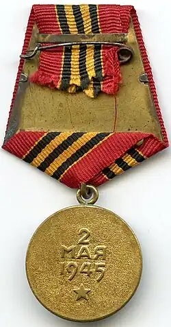 En el reverso, cerca de la parte superior, la fecha en relieve en tres filas sobre una estrella lisa de cinco puntas en relieve «2 de mayo de 1945» (en ruso: «2 МАЯ 1945»).[1]