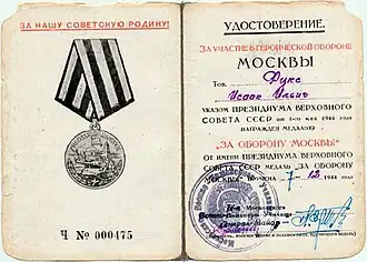 - Militares de la zona de defensa aérea de Moscú y unidades de defensa aérea, así como civiles que participaron de forma activa en la defensa de Moscú contra los ataques aéreos enemigos desde el 22 de julio de 1941 hasta el 25 de enero de 1942;[1]
