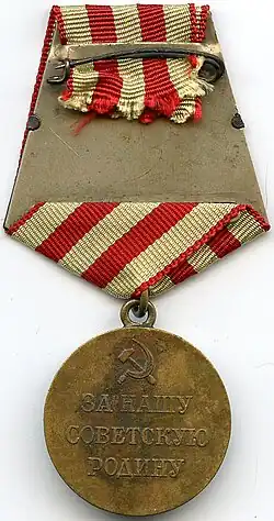 La medalla está conectada con un ojal y un anillo a un bloque pentagonal cubierto con una cinta de muaré de seda de 24 mm de ancho. La cinta tiene tres franjas longitudinales oliva de 5 mm de ancho y dos franjas rojas de 4 mm de ancho. Los bordes de la cinta están bordeados con estrechas franjas rojas.