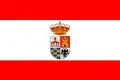 Bandera rectangular de proporciones 2/3, formada por tres franjas horizontales, la central blanca y del tamaño doble que las otras dos, que son de color rojo, con el escudo municipal brochante al centro y en sus colores.