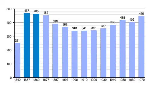 | Gráfica de evolución demográfica de Mediñá[6] entre 1842 y 1970 |