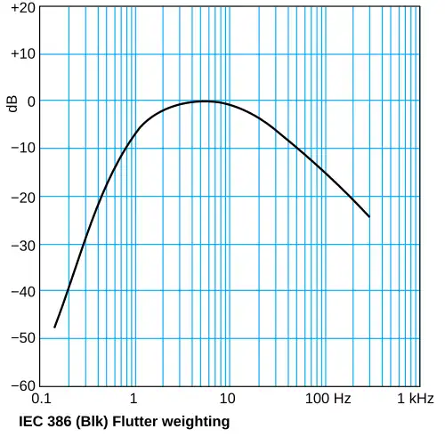 Aunque los términos "wow" (lloro) y "flutter" (trémolo) solían usarse por separado (para oscilaciones a una frecuencia inferior y superior a 4 Hz respectivamente),[2] posteriormente tendieron a combinarse, creándose estándares universales de medición que tienen en cuenta ambos simultáneamente. Los oyentes encuentran el "flutter" más objetable cuando la frecuencia real de oscilación es de 4 Hz, y menos audible por encima y por debajo de esta frecuencia. Este hecho forma la base de la curva de ponderación que se muestra aquí. La curva de ponderación es engañosa, ya que presume la inaudibilidad de los flutters por encima de 200 Hz, cuando en realidad los flutters más rápidos son bastante perjudiciales para el sonido. Un flutter de 200 Hz a un nivel de -50 db creará una distorsión de intermodulación del 0,3 %, lo que se consideraría inaceptable en un preamplificador o amplificador.