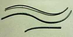 - Utilizados para abrir un tracto urinario bloqueado y dejar que la orina salga libremente del cuerpo. Los primeros catéteres eran tubos huecos hechos de acero o bronce, y tenían dos diseños básicos. Había catéteres con una ligera curva en S para los hombres y unos más rectos para las mujeres. Había dispositivos de forma similar que se usaban para sondear la vejiga en busca de calcificaciones.[34]