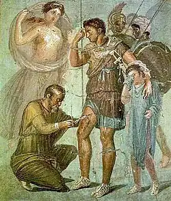 El Imperio romano fue una compleja y vigorosa combinación de elementos culturales griegos y romanos,[2] forjada a través de siglos de contacto. Los autores latinos posteriores, especialmente Catón el Viejo y Plinio el Viejo, creían en un tipo de curación específicamente romano basado en hierbas, cantos, oraciones y amuletos fácilmente disponibles para cualquier cabeza de familia.[3] La medicina griega se introdujo en Italia con el establecimiento y desarrollo de contactos militares y políticos entre las dos regiones.[4] Pero no fue hasta la introducción del dios curativo Asclepio en el 291 a. C. y la llegada del médico griego Archagathus en el 219 a. C. que la medicina extranjera fue aceptada públicamente en Roma.[5]