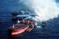 - ↑ a b Reports, Wire. "FIREBOATS ATTACK GULF TANKER BLAZE." Journal of Commerce [Galveston] 12 June 1990, sec. MARITIME: 3B. Lexis Nexis. Web. 21 Jan. 2014.