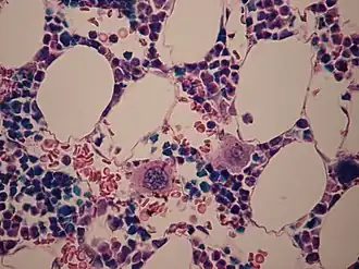 Se observan dos megacariocitos (un poco por debajo del centro) en una muestra de médula ósea. | ||