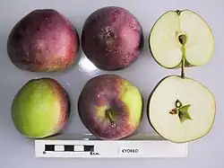 ![]() La variedad de manzana 'Megumi' sinónimo めぐみ con secciones cruzadas. | ||