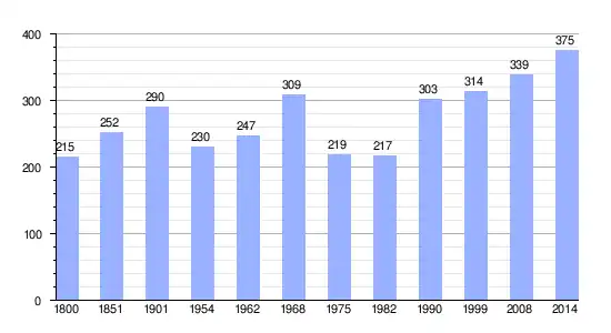Los datos demográficos contemplados en este gráfico de la comuna de Meigné[4] se han cogido de 1800 a 1999 de la página francesa EHESS/Cassini, y los demás datos de la página del INSEE.[5]