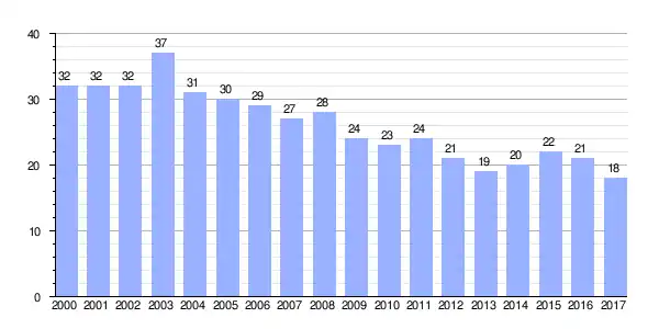 | Gráfica de evolución demográfica de Melezna[2] entre 2000 y 2017 |