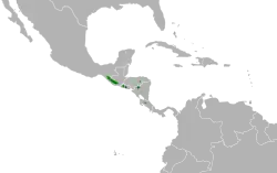Habita en la vertiente del Océano Pacífico, desde el estado de Chiapas (México) hasta el occidente de Costa Rica. Es poco común y de distribución localizada, en montañas de humedad elevada, y desde los 450 m hasta tierras altas cercanas a los 2 000 m snm.