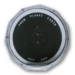 En la parte superior del disco está la inscripción "Goodwill messages from around the world brought to the Moon by the astronauts of Apollo 11" (Mensajes de buena voluntad de todo el mundo traídos a la luna por los astronautas del Apolo 11). En el borde están las inscripciones "From Planet Earth - July 1969" (Desde el planeta Tierra - julio de 1969).