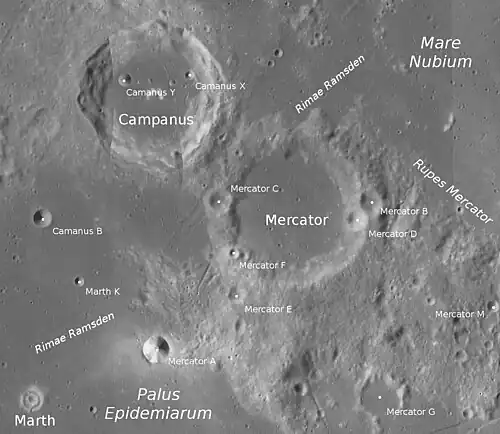 Mercator es un cráter de impacto que se encuentra en el extremo suroeste del Mare Nubium, en la parte suroeste de la Luna, al sureste del cráter Campanus. Ambos están separados entre sí por un valle estrecho y sinuoso.