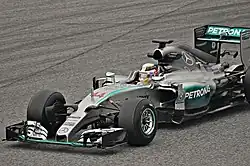 El equipo comenzó el año igual que el anterior, ganando (y haciendo doblete) con una clara superioridad en GP de Australia.[48]​ En la segunda carrera, el GP de Malasia, se vieron sorprendidos por un coche de seguridad que perjudicó su estrategia y Sebastian Vettel se llevó el triunfo, pero se recuperaron rápidamente con otro doblete en China, y volvieron a ganar las 6 carreras siguientes. Tras malas carreras en Hungría y Singapur, donde Sebastian Vettel se llevó la victoria, entraron algunas dudas. Sin embargo, en el GP de Rusia, Mercedes revalida su campeonato de constructores,[49]​ y en la cita siguiente en Austin, Lewis Hamilton también vuelve a proclamarse campeón.[50]​ Las tres últimas carreras de la competición son también ganadas por la escudería, en esta ocasión de la mano de Nico Rosberg, quedando en segunda posición Lewis Hamilton, que no dejó de luchar por los triunfos en ningún momento.