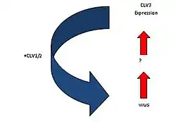 Figura 3: Regulación de la cantidad de células madre en el meristema del tallo, La expresión de WUS en el microambiente es responsable de la producción de una señal desconocida que induce la expresión de CLV3. CLV3 a su vez señala por medio de CLV1/2 para suprimir la expresión de WUS.