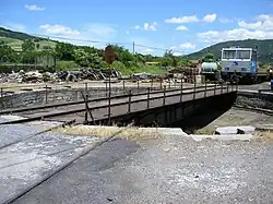 - Esta obra contiene una traducción derivada de «Railway turntable» de Wikipedia en inglés, publicada por sus editores bajo la Licencia de documentación libre de GNU y la Licencia Creative Commons Atribución-CompartirIgual 4.0 Internacional.