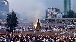 Las celebraciones comienzan con la preparación de la Damera, una hoguera de forma cónica levantada en la Plaza Meskel en Adís Abeba. La Damera se forma con una pila de troncos rodeados por ramas adornadas con flores frescas y hierbas de Abisinia que simbolizan el Año Nuevo. Centenares de miles de personas de diferentes comunidades vienen a la plaza, mientras los sacerdotes, vestidos con ornamentos coloridos, cantan himnos, recitan oraciones y ejecutan un baile rítmico frente a la hoguera. La ceremonia alcanza su momento culminante cuando el patriarca de la Iglesia Ortodoxa Tawahedo enciende la hoguera.