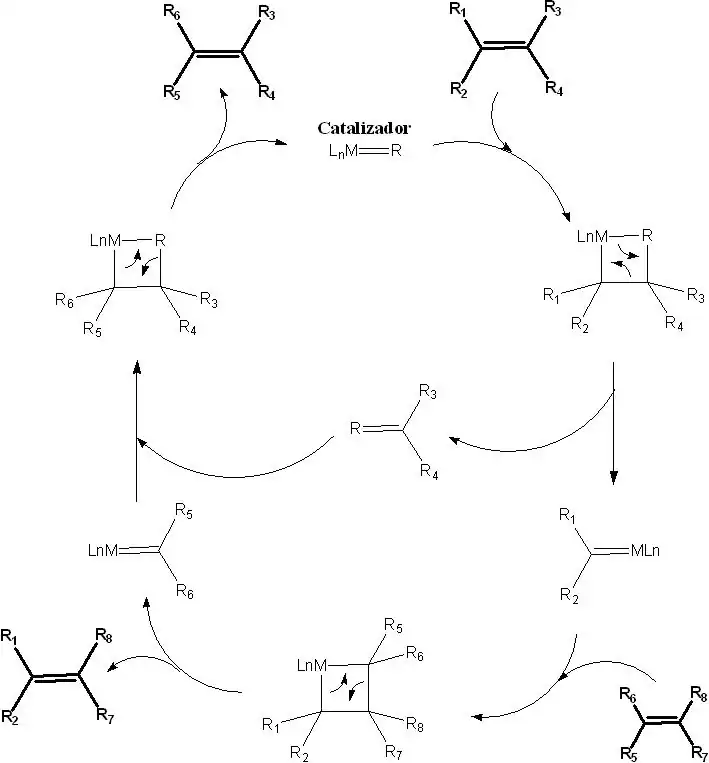 Análogamente a lo que ocurre en una reacción de intercambio iónico, en la que se forma el par iónico más estable a partir de otros dos iniciales, en química orgánica la metátesis es una reacción reversible y catalizada, en la que se produce una reorganización del enlace de la olefina, lo cual resulta en una redistribución de sus dos mitades de alquilideno. En general, las olefinas intercambian grupos alrededor de los dobles enlaces en presencia de carbenos metálicos (catalizadores) en los que participan ciertos metales de transición. Según sea la naturaleza de este metal (titanio, wolframio, molibdeno o rutenio, fundamentalmente), su reactividad frente a las olefinas es distinta, así como su tolerancia a otros grupos funcionales y a agentes medioambientales.[1]​ Generalmente los catalizadores utilizados son metales de transición, generalmente de Mo o Ru del tipo LnM=R (o LnM≡R para 2 alquinos), los cuales han sido desarrollados por Robert H. Grubbs y Richard R. Schrock. Según esto, el mecanismo general (propuesto por Yves Chauvin) de una metátesis responde entonces al siguiente esquema: