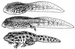 En urodelos o caudados (salamandras), la metamorfosis implica la reabsorción de la aleta de la cola, la destrucción de las branquias externas y un cambio en la estructura de la piel. En anuros (sapos y ranas), los cambios son más dramáticos, y casi todos los órganos son sometidos a modificación. Comienza con cambios regresivos como la pérdida de los dientes puntiagudos, branquias y destrucción de la cola. Al mismo tiempo, ocurren procesos constructivos como el desarrollo de las patas posteriores, seguido por el de las patas anteriores, y la morfogénesis de las glándulas dermoides. El cráneo cartilaginoso del renacuajo es sustituido por uno óseo, junto con modificaciones de la boca y la mandíbula y el desarrollo de los músculos de la lengua. Los arcos branquiales se degeneran, los pulmones se agrandan, y los músculos y cartílago pulmonar se desarrollan para facilitar el bombeo de aire. El sistema sensorial cambia pues la línea lateral se degenera, y se produce diferenciación en ojos y oídos. El oído medio y la membrana del tímpano se desarrollan y en el ojo emerge la membrana de los párpados. Los intestinos se acortan para adaptarse a la dieta carnívora y los ojos emigran hacia la región frontal y dorsal de la cabeza, acorde con un estilo de vida de predador. En la larva no hay proyecciones ipsilaterales (del mismo lado) de las neuronas de la retina, sin embargo, durante la metamorfosis estas vías emergen permitiendo que entradas neuronales de ambos ojos lleguen a la misma área del cerebro.