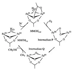 Primeramente tenemos que establecer que inicia a partir del MMOHred, el cual reacciona de forma rápida con el oxígeno molecular, dando lugar a un compuesto meta estable, después esta molécula automáticamente se convierte en otro intermediario que recibe el nombre de P, de la misma forma esta pasa a otro compuesto intermediario que recibe el nombre de Q, este es más conocido porque se sabe que los centros de Hierro son de alto spin y anti ferromagnéticos; además es considerado como una pieza clave durante la oxidación de especies químicas. Al entrar en contacto con la molécula a ser reducida, el intermediario Q puede seguir dos vías de reacción: una con radical y otra sin radical, sin embargo estudios experimentales muestran que aún es incierto como ocurre la reacción en cualquiera de las dos vías y aun así se cree que el mecanismo podría ser totalmente diferente a lo que conocemos.[6]