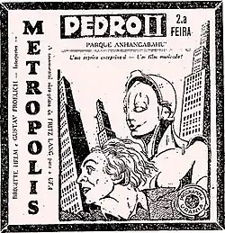 - ↑ a b «CINES IRIS PARIT- ROYAL CINE» (PDF). La Vanguardia (Barcelona). 29 de mayo de 1927. p. 23. «Noche, acontecimiento cinematográfico con el estreno de la monumental película en dos capítulos, proyectándose el primero: METRÓPOLIS (La ciudad sobre las ciudades)».