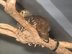 Tiene el dorso pardo y el vientre ceniciento; y el periocular anaranjado; sus patas rosáceas.
