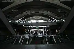 - Baixa-Chiado tiene una arquitectura de diseño modernista (del arquitecto Álvaro Siza Vieira, con intervenciones plásticas del pintor Ângelo de Sousa) localizada a 45 metros de la superficie de Chiado, que hacia Baixa tiene la salida prácticamente al nivel de la estación, dando origen así a una serie de túneles de salida interconectados y revestidos de azulejos blancos con inscripciones doradas.[37][38]
