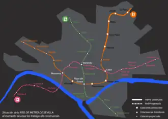 El proyecto de la línea 3 del Metro de Sevilla fue anunciado oficialmente en enero de 2022.[13] Se espera que la construcción del tramo norte finalice en el año 2030. Las obras del ramal técnico al norte de Pino Montano comenzaron en febrero de 2023 y las primeras obras en plena ciudad comenzaron el 8 de abril de 2024, mismo mes en el que se pusieron las primeras vías sobre el ramal técnico.[14] El tramo sur de la línea aún no ha comenzado sus obras, al no tener un trazado aprobado de manera definitiva.