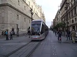 El Metrocentro de Sevilla, conocido popularmente como Tranvía de Sevilla, es un sistema tranviario de transporte público que recorre el centro de la ciudad andaluza de Sevilla (España). Fue inaugurado el 28 de octubre de 2007. Su trazado une la avenida Luis de Morales, en el distrito Nervión, con Plaza Nueva, situada en el casco histórico.[2] El sistema consta de una línea única, identificada como T1, propiedad del Ayuntamiento de Sevilla y operada por la empresa municipal de transportes TUSSAM.