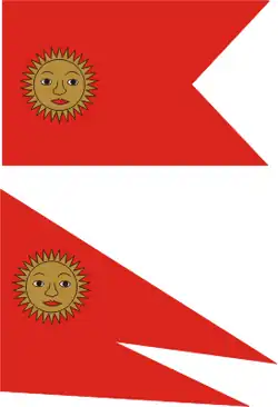 - 1727, triangular rojo con sol dorado sin rostro y pequeña decoración por toda la tela (más abundante que en el anterior); fleco dorado