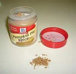 - Especia de pastel de calabaza, una mezcla estadounidense de canela, clavo, nuez moscada y pimienta de Jamaica