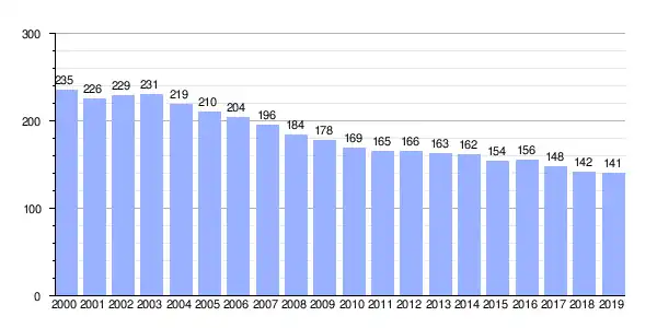 | Gráfica de evolución demográfica de Mezonzo entre 2000 y 2019 |