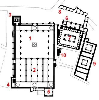 ![]() Vista de la esquina noroeste de la mezquita, con su alminar corto y ancho (derecha) | ||